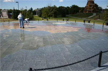 This beautiful work of art is 75 feet in diameter and executed in different colored granite tiles with a background of Norwegian Blue Pearl Granite. The shimmering blue-black granite, (representing the ocean of Scandinavia), creates a dramatic vision and a most unique structure for the park.